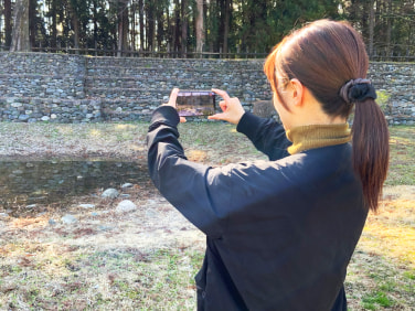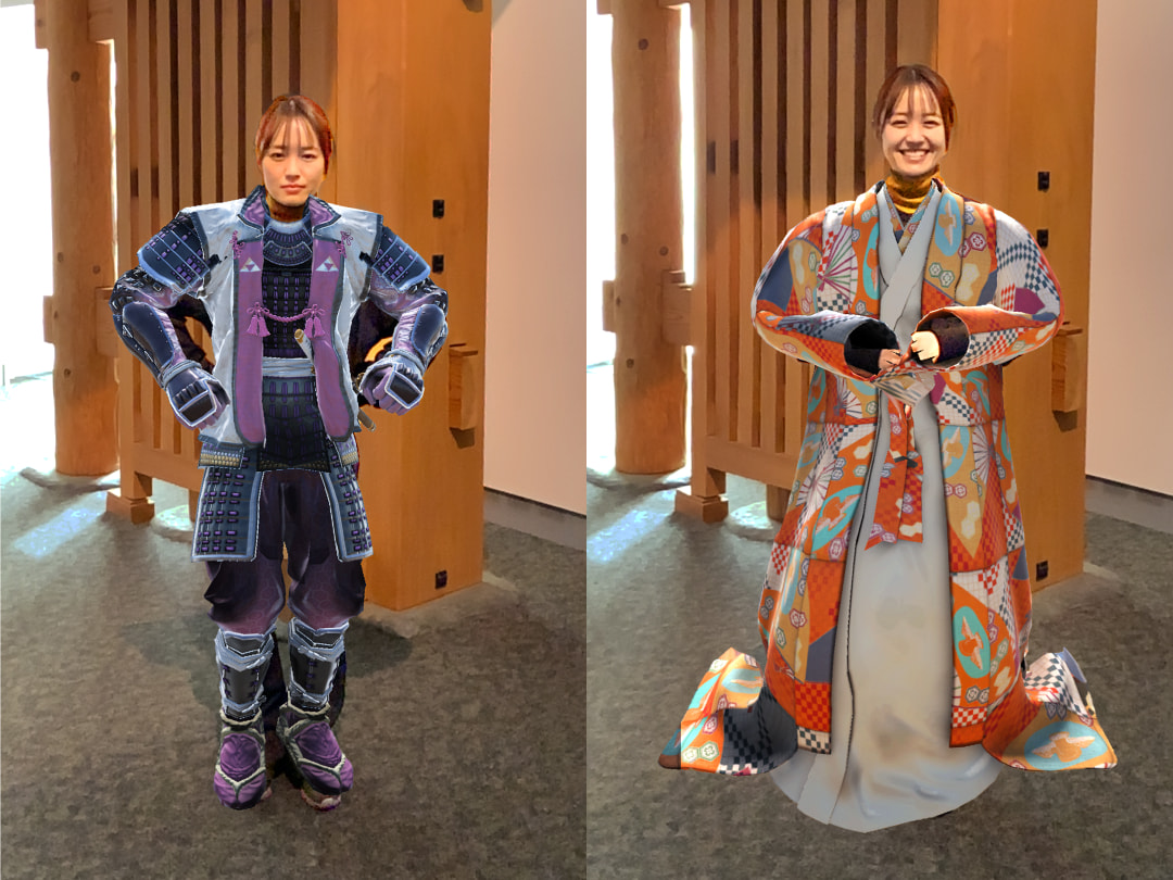 館内に復元された櫓門そばのマーカーをアプリで認識すると、ARで甲冑や打掛を着用できます。身体の動きに追従しますので(※)、思い思いのポーズで記念撮影をすることができます。