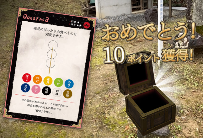 謎を解き、ARで出現する宝箱を発見するとポイントゲット!
