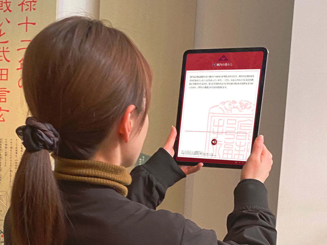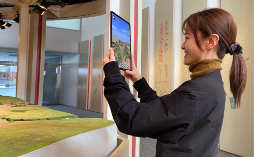 鉢形城地形模型に設置されたマーカーをアプリで認識すると、天正18年の鉢形城攻防戦の様子を再現した鉢形城復元高精細360°CGを体験できます。 また、館内のVRゴーグルでは鉢形城復元をVRで体験。まさに戦国時代に舞い降りた、これ以上ない臨場感で鉢形城を体感できます。